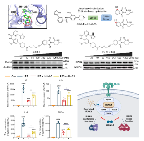 研究人员通过分析IRAK4激酶抑制剂JH-I-25与靶标的结合模式,合成了一系列针对IRAK4的蛋白降解靶向嵌合体分子,其中化合物LC-MI-3在细胞水平对IRAK4具有最佳的降解效果。与激酶抑制剂JH-I-25相比,LC-MI-3在细胞水平能通过同时抑制TLR下游MAPK和NFκB通路的激活,从而发挥更强的抗炎效果。KINOMEscan激酶谱和蛋白质谱实验分析发现LC-MI-3针对IRAK4靶标具有高度的选择性。