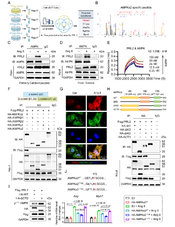 为了明确PRL2调控AMPK去磷酸化的潜在分子机制,我们通过液相质谱-串联质谱(LC-MS/MS)、免疫共沉淀(Co-IP)、生物膜干涉技术(BLI)等实验进一步确认PRL2与AMPKα2 CTD结构域结合,并通过C46酶活位点去磷酸化AMPK T172,进而诱导心肌细胞能量代谢障碍和心肌肥厚(图2)。