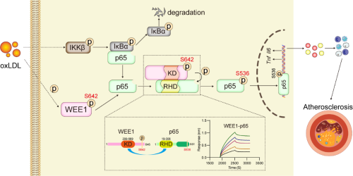 本研究报道了巨噬细胞中的蛋白激酶WEE1在动脉粥样硬化中的作用,发现巨噬细胞特异性缺失或抑制WEE1激酶活性的药理作用可以通过抑制NF-κB介导的炎症来减轻动脉粥样硬化的进展。机制上,激活后的WEE1能够直接结合p65并特异性磷酸化其S536位点,随后激活NF-κB及下游的炎症因子风暴。这一突破性发现不仅阐明了WEE1- p65信号轴在动脉粥样硬化中的分子调控机制,更为动脉粥样硬化的防治提供了新的理论依据和潜在治疗靶点,具有重要的临床转化价值。