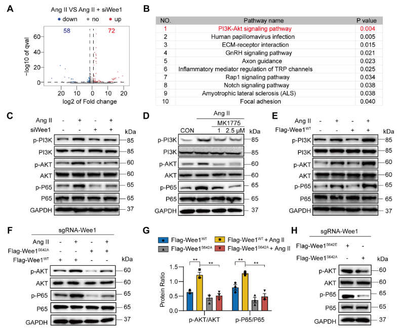 Wee1的磷酸化参与心肌细胞肥厚的调控,并且Wee1的这一作用依赖于其S642位点磷酸化后产生的激酶活性。Wee1是调节细胞周期和增殖的典型激酶。研究者发现Wee1在终末分化的心肌细胞中不作为细胞周期调节激酶,而是通过调控下游底物磷酸化,参与心肌细胞内重要的信号转导过程。为了研究Wee1可能调控的下游信号通路,阐明Wee1如何介导AngII诱导的心肌细胞肥大,研究者利用乳大鼠原代心肌细胞(NRVMs)沉默Wee1并经AngII处理的NRVMs进行了RNA测序分析。KEGG富集分析表明,这些基因在PI3K-AKT通路中富集程度最高,并且Wee1 Ser642磷酸化激活PI3K/AKT信号通路,诱导心肌细胞炎症和肥厚反应(图二)。