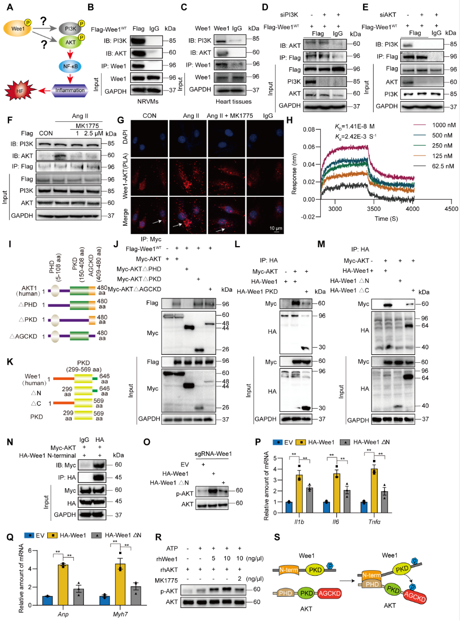 Wee1通常被认为是一种细胞周期S-G2检查点抑制蛋白,通过磷酸化CDK1以阻止有丝分裂进入;CDK1是Wee1的典型下游激酶。但是研究者发现Wee1介导的心肌细胞损伤与CDK1无关。这些结果也促使研究者考虑PI3K或AKT是否为Wee1的直接下游激酶。通过免疫共沉淀(Co-IP)、邻近连接实验(PLA)和生物膜干涉实验(BLI)分析发现,AKT是Wee1的直接底物蛋白。随后,研究人员探索了Wee1-AKT相互作用的特定结合域,进一步确认Wee1的N端结构域与AKT的PHD结构域结合(图三)。