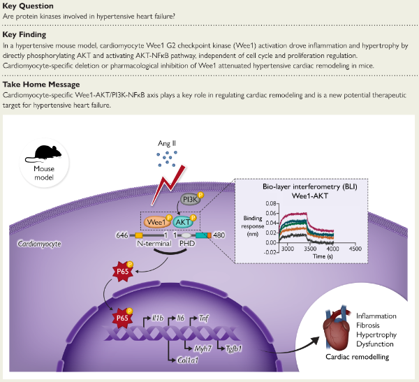 综上所述,本研究揭示了高血压心力衰竭中心脏Wee1激酶活性的异常激活现象,表现为心肌细胞Wee1磷酸化水平显著上调。心肌细胞特异性缺失或药物抑制Wee1可减轻AngII诱导的心脏重构。研究结果突显了成熟心肌细胞中的Wee1已不具备细胞周期调控蛋白的经典功能,而是通过直接结合并磷酸化底物蛋白AKT,激活AKT/PI3K-NFκB信号通路,推动心肌慢性炎症和病理性肥大。这一发现不仅揭示了经典的细胞周期检查点蛋白激酶Wee1的调控心脏肥厚的新功能和新机制,为临床治疗相关心脏疾病提供了新的分子靶点。
