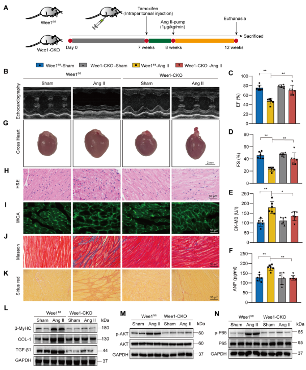 图四.心肌细胞中Wee1的缺失减轻了AngII诱导的病理性心脏重构