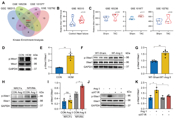 研究者基于多个高血压心力衰竭小鼠模型的RNA测序数据,通过激酶富集分析(KEA)筛选并鉴定了蛋白激酶Wee1的S642位点磷酸化水平在人和小鼠的高血压心脏中显著上调。Wee1是细胞周期检查点激酶之一,它控制DNA复制和染色体凝聚,通过调节细胞周期的功能在肿瘤进展中发挥重要作用,在多种癌症中观察到高水平的Wee1表达和活性,Wee1已成为抗肿瘤新药研发的重要靶点。然而,Wee1在心肌细胞和高血压性心力衰竭中的作用尚未见报道。