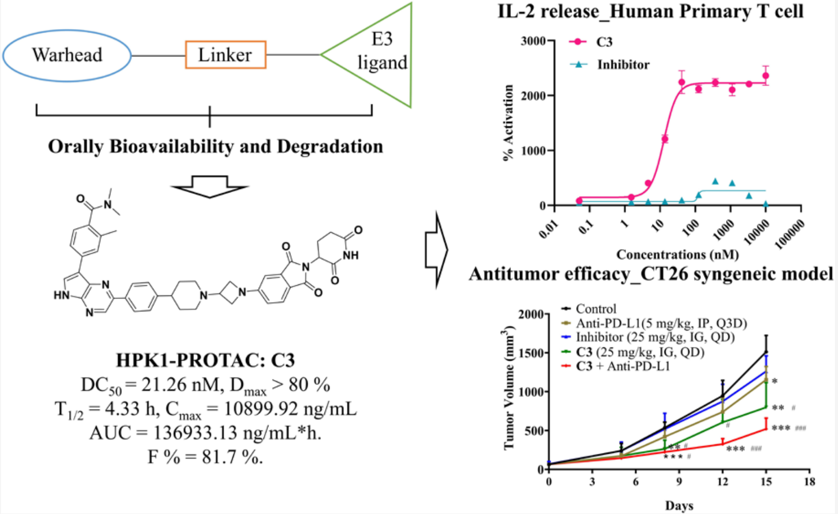 该论文成功开发了一种新型的HPK1 PROTAC分子(C3),该分子展现出卓越的口服生物利用度和强大的抗肿瘤效果,为肿瘤免疫治疗提供了新的策略和方向。