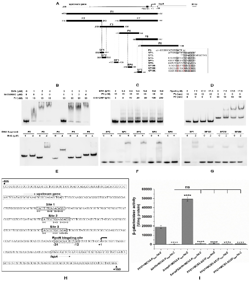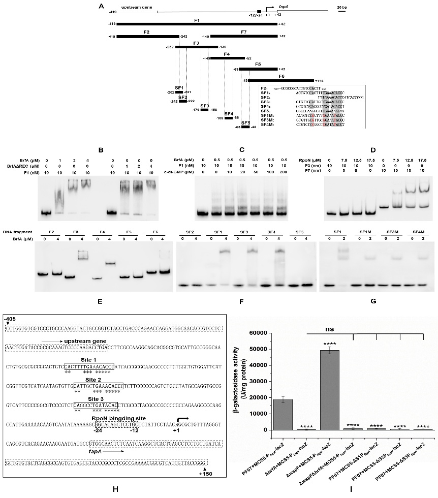 在该论文中,研究者发现fapA-F基因簇与相邻的反向基因(命名为brfA)在假单胞菌中广泛存在,brfA预测编码一个新的NtrC家族增强子结合蛋白,包括N端REC结构域,内部保守AAA+ATPase 结构域和C端DNA结合结构域。基因敲除和转录组测序显示BrfA对fap基因簇有显著调控作用(图1)。体内实验证明,REC结构域缺失促进fapA的表达和生物被膜的形成(图2);c-di-GMP采用BrfA依赖的方式调控fapA的转录(图3)。体外实验表明,BrfA的ATP酶活性受REC结构域抑制,但受c-di-GMP激活(图3);BrfA和sigma因子RpoN能够直接结合fapA的上游调控区;BrfA的DNA结合作用不受REC结构域和c-di-GMP的影响;BrfA能够识别并结合fapA启动子上游的三个串联增强子结合位点CA-(N4)-TGA(A/T)ACACC(图4)。进一步通过体内lacZ转录融合报告载体证明这三个增强子结合位点对于fapA的转录都是必不可少的(图4)。