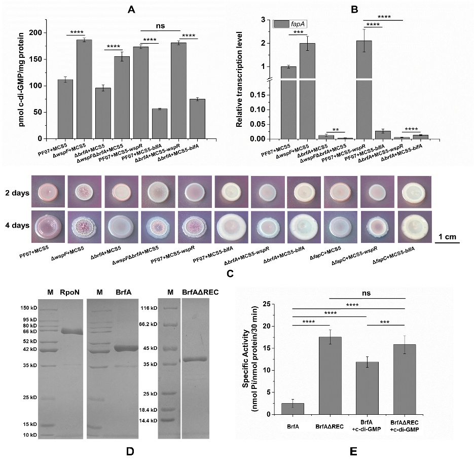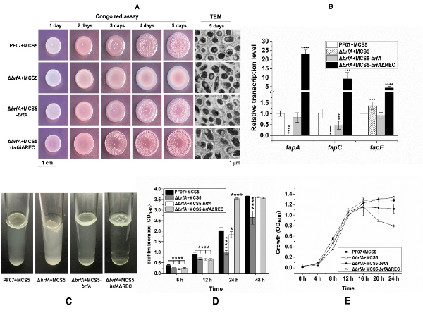 图2. BrfA的REC结构域缺失促进fap基因簇的转录和生物被膜的形成