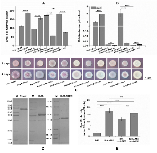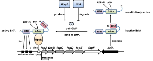 综上所述,BrfA作为一种新型增强子结合蛋白,其应答c-di-GMP和调控下游基因转录的方式与已知其他转录因子显著不同。BrfA和Fap的同源蛋白广泛存在于假单胞菌中,该发现揭示了假单胞菌中生物被膜调控的新机制,为假单胞菌生物被膜的调控提供了新思路和新靶标。